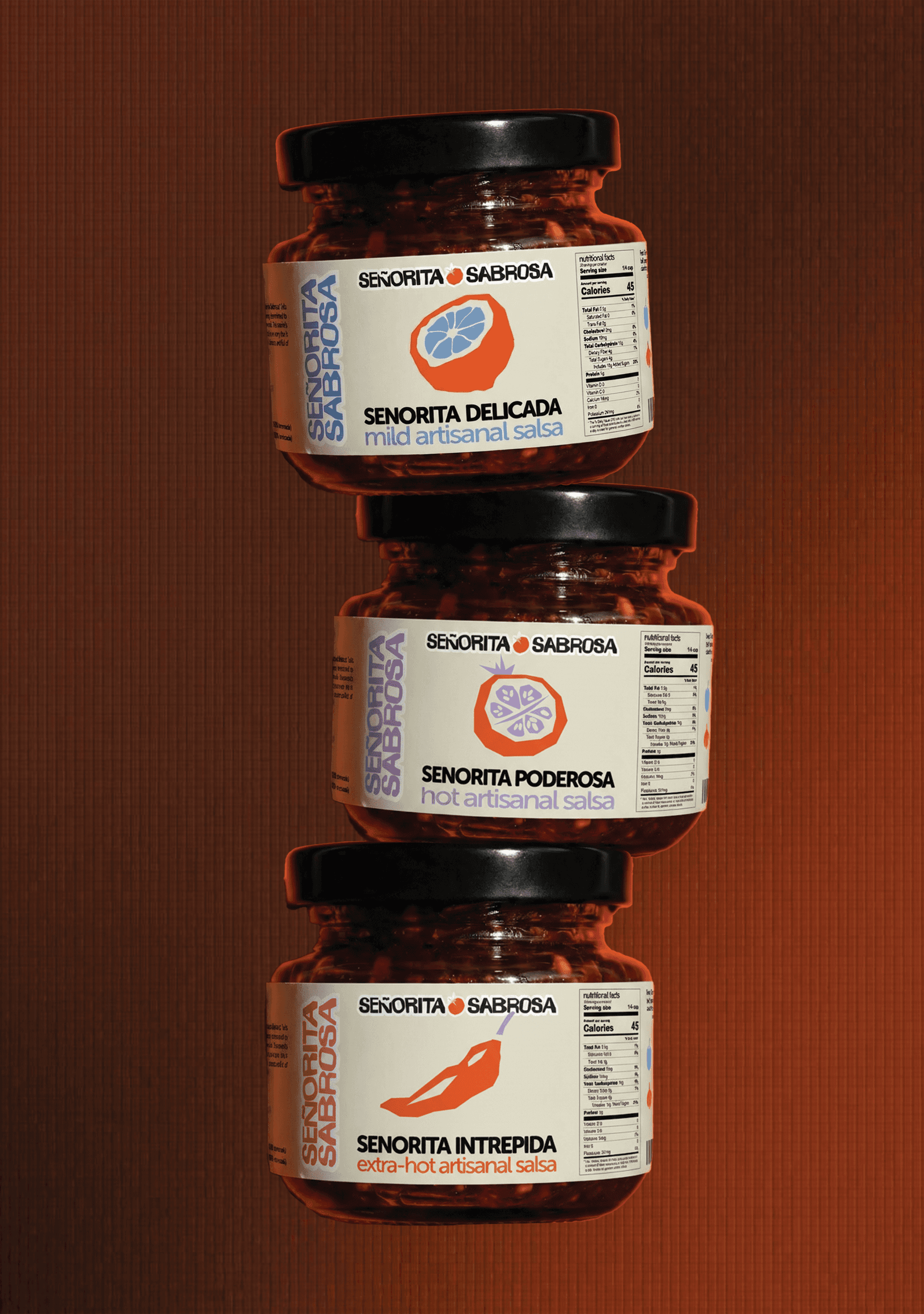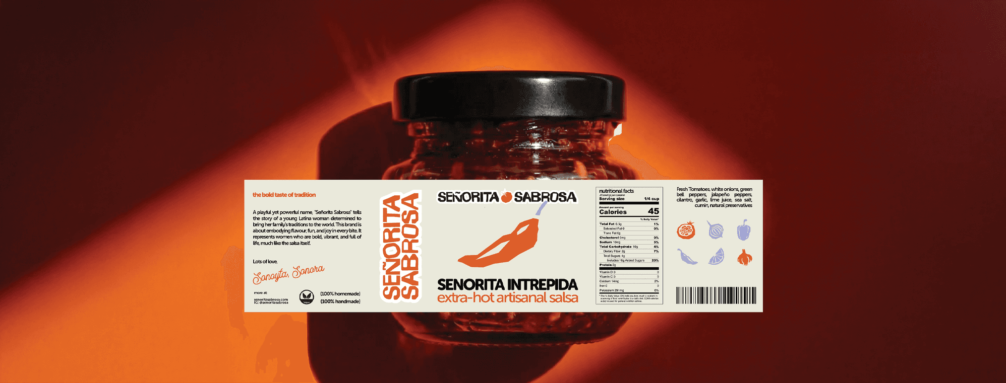 The Brief: Señorita Sabrosa is a family-led salsa brand inspired by matriarchs, heritage recipes, and the joy of sharing food. The goal was to create packaging that stood out on crowded shelves, breaking away from the typical cluttered, rustic salsa aesthetic. It needed to feel bold, vibrant, illustrative, yet still warm and inviting, celebrating Latina identity with a modern edge. Our Approach: Our focus was twofold: instant shelf impact and an authentic cultural narrative. We moved away from predictable browns and busy layouts, instead embracing confident typography, strong negative space, and a warm, saturated colour palette of reds, oranges, and soft lilac accents. The result is a brand that feels celebratory, contemporary, and rooted in tradition. One that doesn’t blend in, but proudly stands out, and highlights the bold taste of tradition.